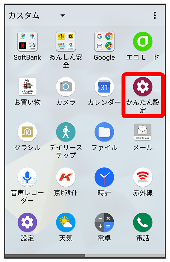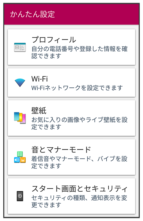 ホーム画面でかんたん設定には次の項目があります。