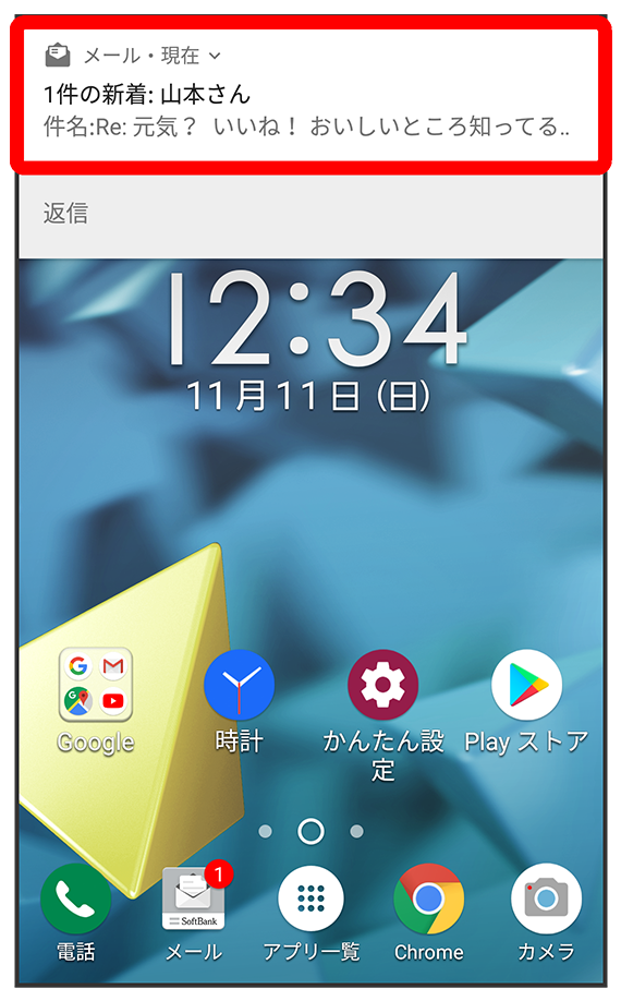 新着メールを受信すると、新着メッセージの通知と、通知アイコンが表示されます。