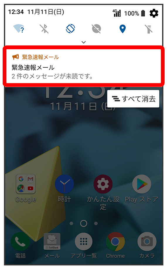 とメッセージが表示され、緊急地震速報/津波警報/災害・避難情報個別の警告音およびバイブレータでお知らせします。