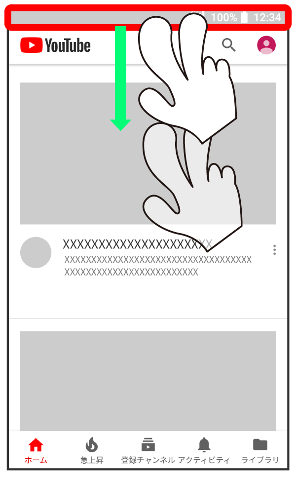 ロックしたいアプリを起動し、ステータスバーを2本指で下にドラッグ