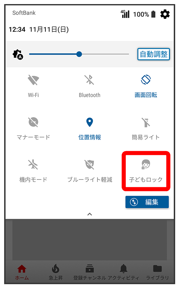 ステータスバーを2本指で下にドラッグをロングタッチ各項目を設定子どもロックの解除時にスタート画面のセキュリティをかけるように設定する