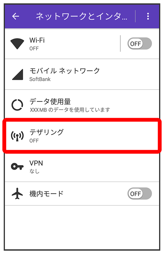 テザリング画面が表示されます。