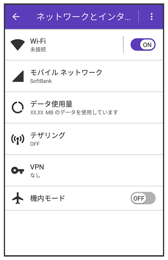 Wi-Fiやモバイル ネットワーク、データ使用量など、ネットワークやインターネットに関する設定ができます。
