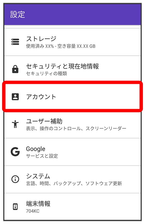 アカウントの設定画面で、同期するアカウントをタップ同期する項目をタップ- 同期する項目をタップするたびに、ON(