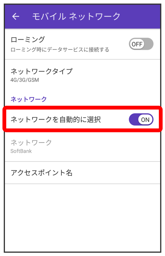 - 自動的に適切な通信事業者に接続する場合は、をONにします(