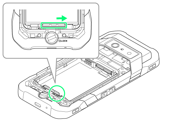 電池ロックを「LOCK」の方向(左側)にスライドさせる