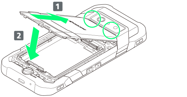 電池カバー全体に浮きがないように注意しながら、端末上部(カメラ側)から順に矢印の箇所を押してしっかりと閉じる