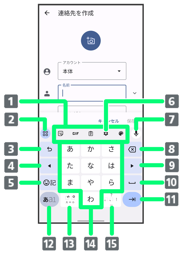 - 文字入力モードを切り替えます(ひらがな/英字/数字)。2
