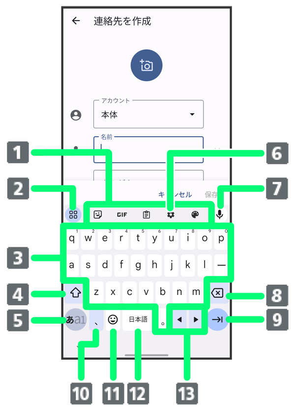 - 文字入力モードを切り替えます(ひらがな/英字/数字)。