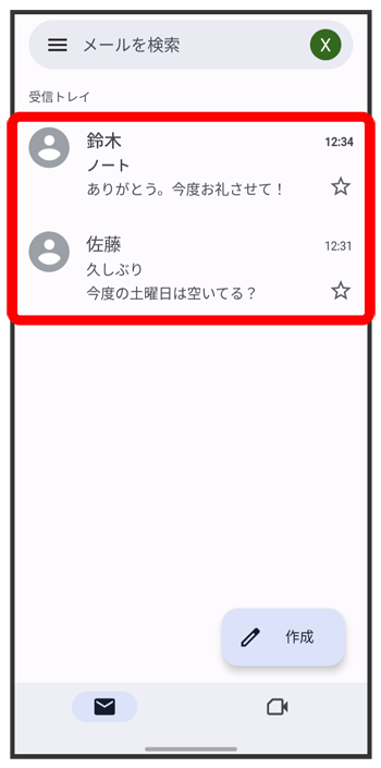メール一覧画面で未読にするメールをロングタッチメールを削除する