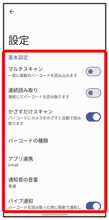 | かざすだけスキャン | 本機のアウトカメラを向けるだけで、自動でデータを読み取るかどうかを設定します。 |