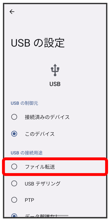 - 本機上に「ファイル転送を有効にする」画面が表示されたら、をタップします。これ以降の操作は不要です。