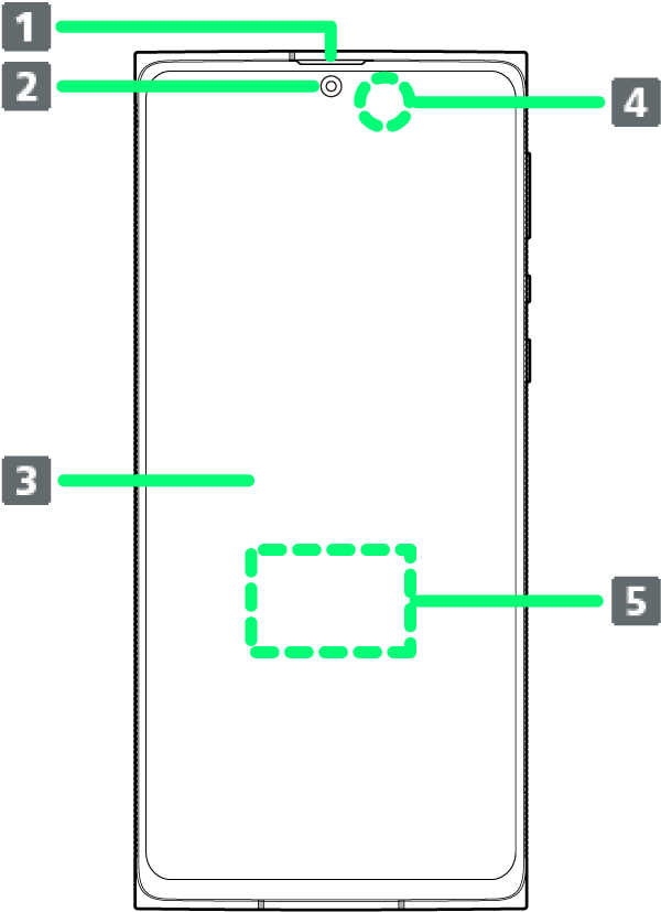 | 近接/明るさセンサー1 | 近接センサーは通話中にタッチパネルの誤動作を防ぎます。明るさセンサーは周囲の明るさに合わせて、ディスプレイの明るさを調節します。 |