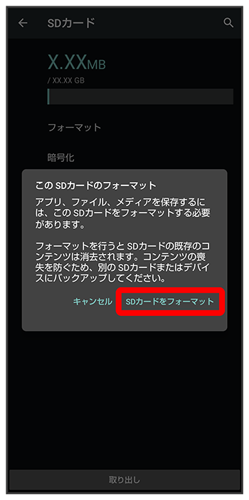 - フォーマットすると、SDカード内のデータがすべて消去されます。SDカードをフォーマットするときは、ご注意ください。