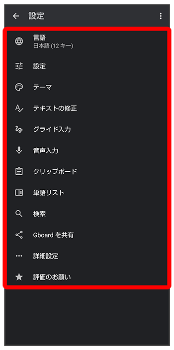 Gboardに関する動作を設定できます。設定できる項目は次のとおりです。