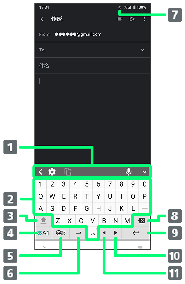 - 絵文字/記号/顔文字を入力(ロングタッチすると、入力拡張プラグインを表示。文字入力中は、カタカナ/英字変換3)