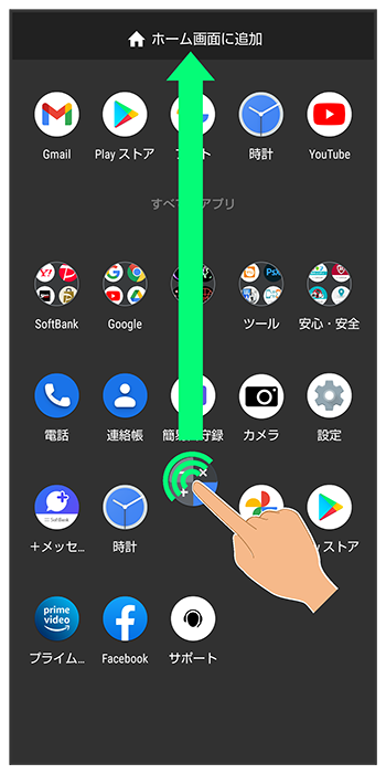アプリ一覧画面でアプリをロングタッチし、「ホーム画面に追加」までドラッグ