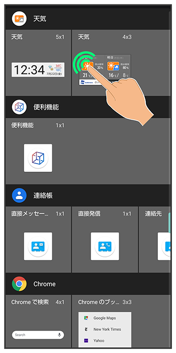 - 画面の端に表示されるシートまでドラッグすると、シートを切り替えてウィジェットを追加できます。一番右端のシートまでドラッグすると、シートを1枚増やして追加できます。