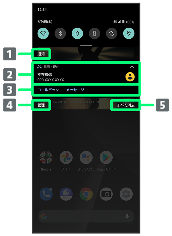 - 通知によって利用できる機能は異なります。たとえば着信の通知では、着信のあった電話番号に発信したり、SMSを送信できます。