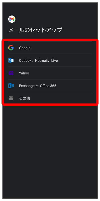 - すでにGoogle アカウントでログインしている場合は、アカウント設定画面は表示されません。別のアカウントを追加するときは、「アカウントを追加する」を参照してください。