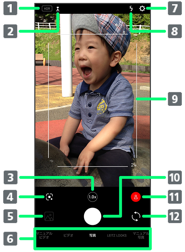 撮影時の各種設定を行います。詳しくは、「写真撮影の設定をする」、「写真/動画撮影共通の設定をする」を参照してください。 - モバイルライト