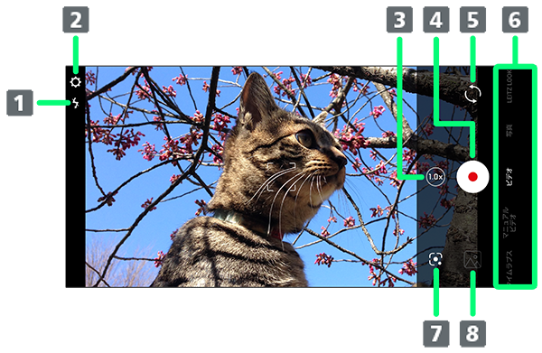 撮影時の各種設定を行います。詳しくは、「動画撮影の設定をする」、「写真/動画撮影共通の設定をする」を参照してください。 - ズーム倍率1