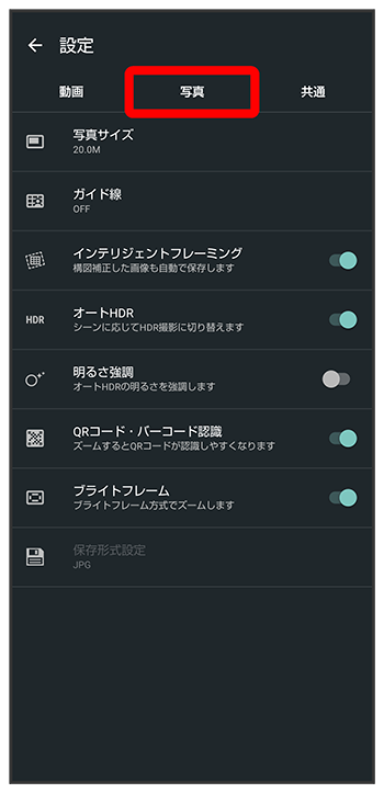 | インテリジェントフレーミング | 撮った写真と一緒に、自動で構図補正した写真を保存するかどうかを設定します。 |