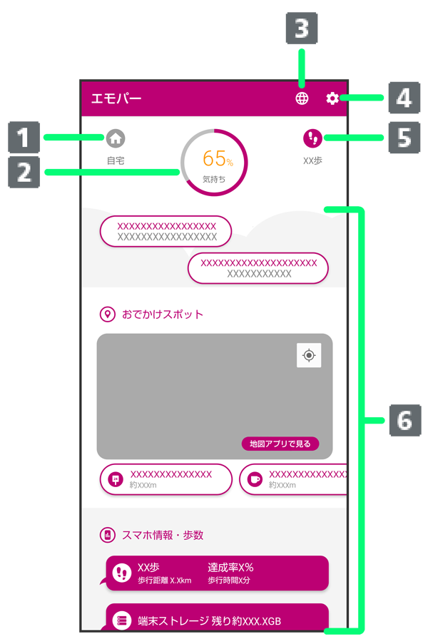 エモパー画面では、エモパーとあなたとのコミュニケーション度合いを確認したり、情報の登録や設定を行ったりすることができます。