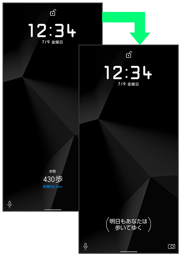 ロック画面では、エモパーがいろいろな情報をお知らせします。左右にフリックすると、情報を切り替えることができます。