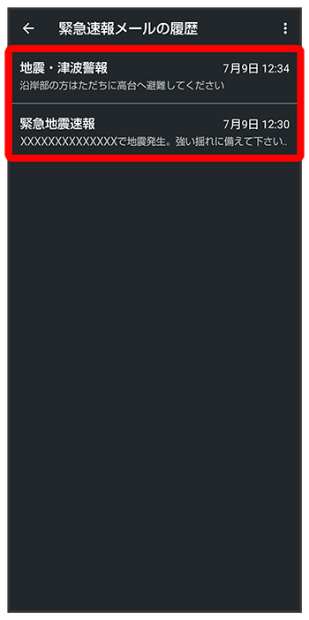 緊急速報メール受信メッセージ一覧画面が表示されます。