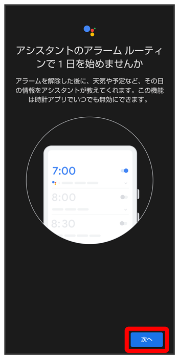 - アラーム解除後にアシスタントからお知らせを教えてもらうように設定する場合は、日時や操作を選択したあとにをタップします。