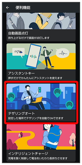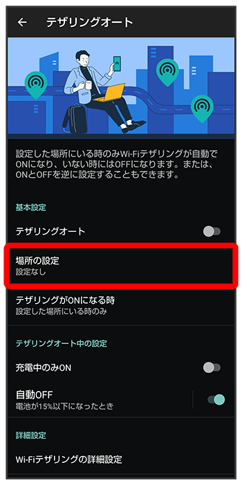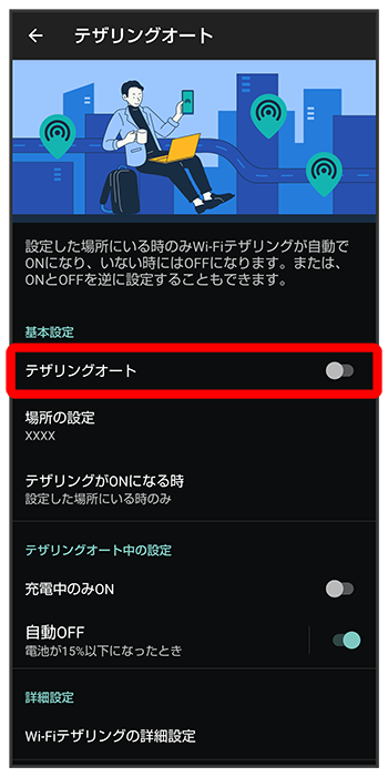 テザリングオート画面で削除したい場所のWi-Fiテザリングが有効になるタイミングを設定する