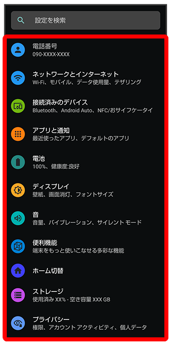 | プライバシー | アプリの権限やパスワードの表示などが設定できます。 |
