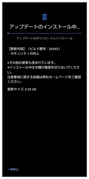 - システムアップデート中もほかの機能を使用できます。ただし、システムアップデートの通知後10日間は、システムアップデート中にほかの機能を使用していると、アップデートのインストールが一時的に停止されます。をタップすると、インストールが再開され、ほかの機能も使用可能になります。