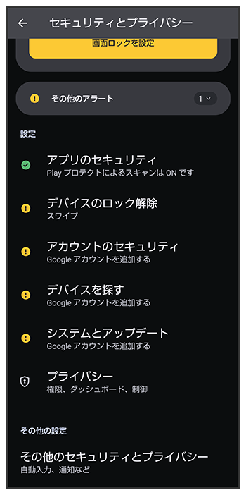 | アカウントのセキュリティ | 項目が追加され、本機や、ログイン中のGoogle アカウント、Google アカウントに保存したパスワードのセキュリティに問題ないかを確認できます。 |