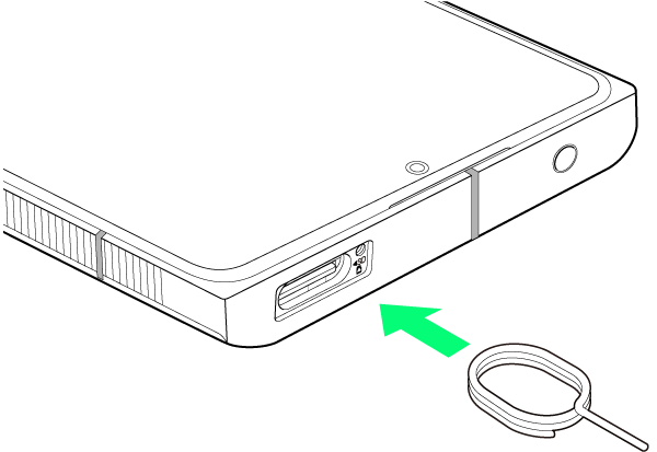 ディスプレイを上にして、カードトレイ取り出し用の穴に、SIM取り出しツールの先を差し込む