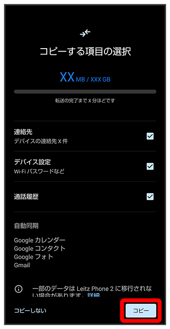 - Google アカウントを設定すると、引き継ぎ可能なデータの一覧が表示されます。