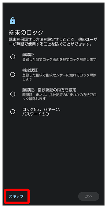 - 画面ロック解除方法をタップ次へと操作すると、選択した画面ロック解除方法の設定ができます。詳しくは、「指紋認証機能を利用する」、「パターンを指でなぞって画面ロックを解除するように設定する」、「ロックNo.(PIN)で画面ロックを解除するように設定する」、「パスワードで画面ロックを解除するように設定する」、「顔認証機能を利用する」を参照してください。