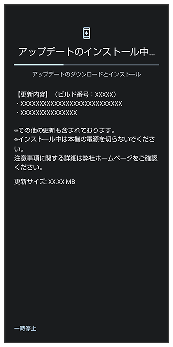 - システムアップデート中も他の機能を使用できます。ただし、システムアップデートの通知後10日間は、システムアップデート中に他の機能を使用していると、アップデートのインストールが一時的に停止されます。をタップすると、インストールが再開され、他の機能も使用可能になります。