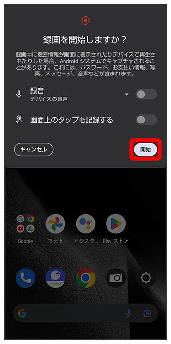 スクリーンレコード開始画面で「画面上のタップも記録する」の