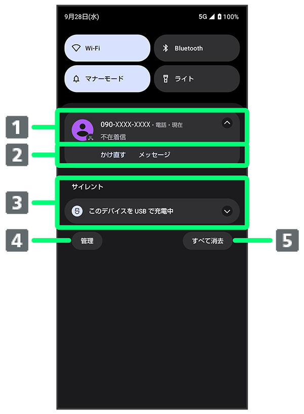 - 通知によって利用できる機能は異なります。たとえば着信の通知では、着信のあった電話番号に発信したり、SMSを送信できます。