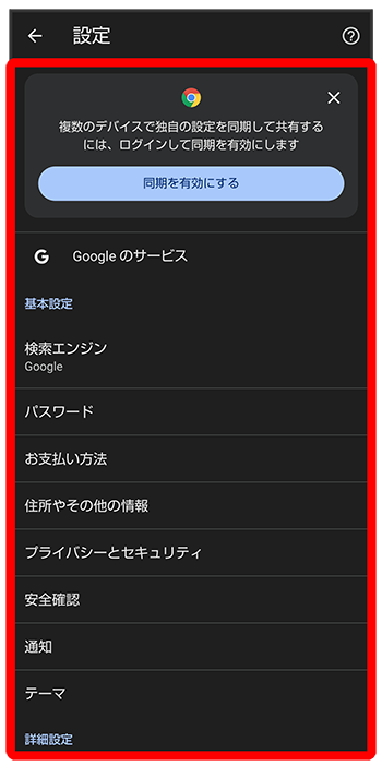 | 同期を有効にする | Google アカウントでログインして、ブックマークや履歴などの設定を利用できます。ログインすると、アカウント情報が表示されます。 |