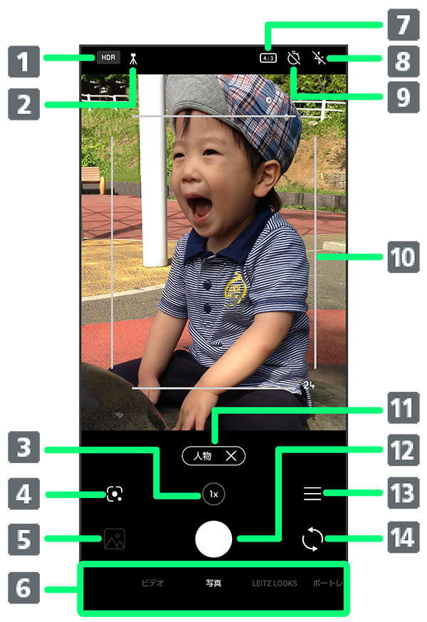- インカメラのときは、タップするとズーム倍率の調節バーが表示されます。調節バーを左右にドラッグして、ズーム倍率を調節できます。