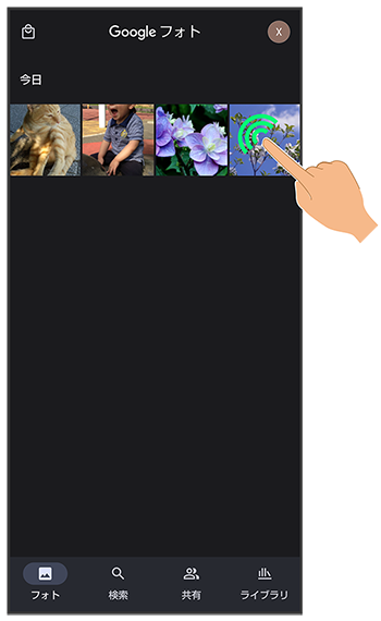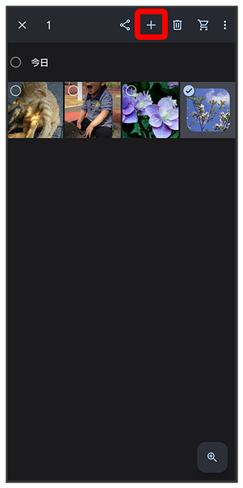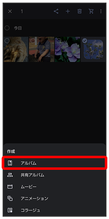 フォト画面で「アルバム」欄から写真/動画を追加したいアルバムをタップ追加したい写真/動画をタップ(- 写真/動画をタップするたびに、選択(