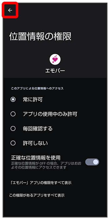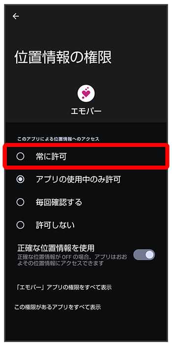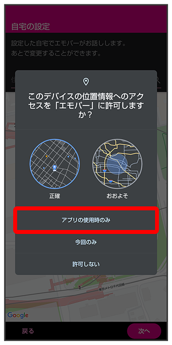 - 正確な位置情報の利用を許可するときはを、おおよその位置情報の利用を許可するときはを選択してください。