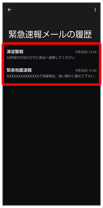 緊急速報メール受信メッセージ一覧画面が表示されます。