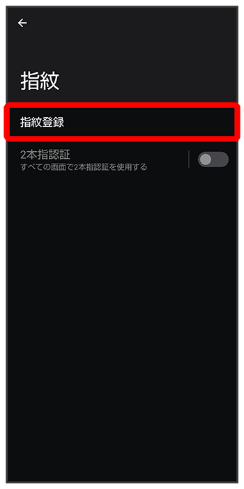 指紋設定画面でパターン/ロックNo.(PIN)/パスワードを入力登録した指紋の指紋認証を行う画面で、指を2本使用するかどうかを設定する