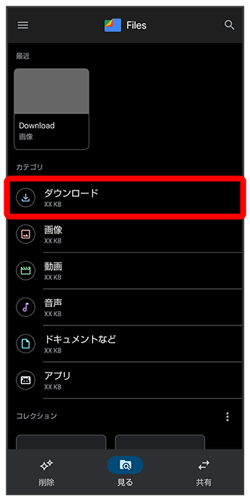 ダウンロード画面で、ファイルをロングタッチ- リスト表示でファイル名の右の