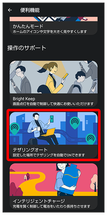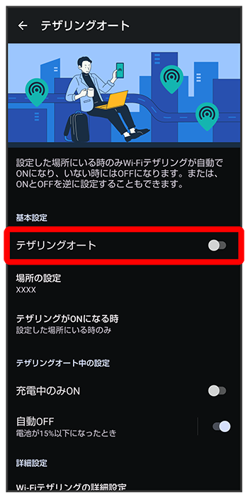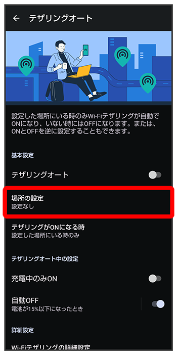テザリングオート画面で削除したい場所のWi-Fiテザリングが有効になるタイミングを設定する