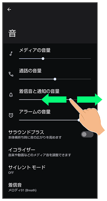 を右にドラッグすると音量が大きく、左にドラッグすると音量が小さくなります。